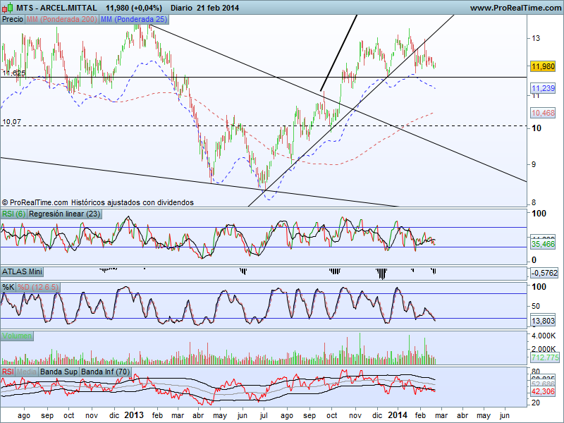 En diario vemos al precio en un lateral entre 13 y 11,60 euros tras la pérdida de la directriz alcista que le llevó a la ruptura del canal y de la resistencia. Atlas avisando del movimiento e indicadores sobrevendidos.